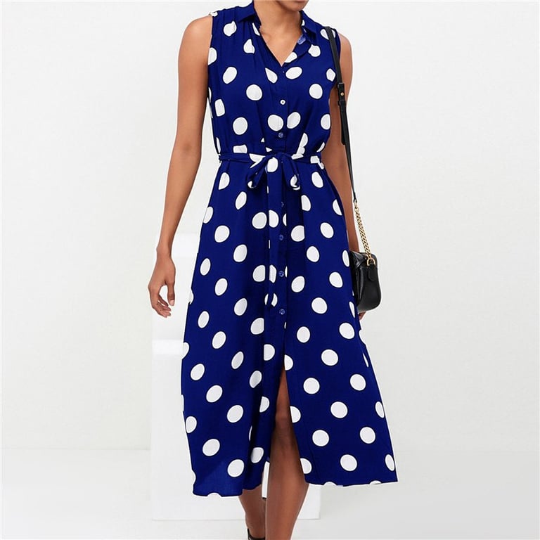 Ženske duge haljine u retro stilu s točkastim uzorkom. Haljine su bez rukava. Izrez s ovratnikom. Kopčanje na gumbe i pojas za vezanje u struku. Na izbor više boja.