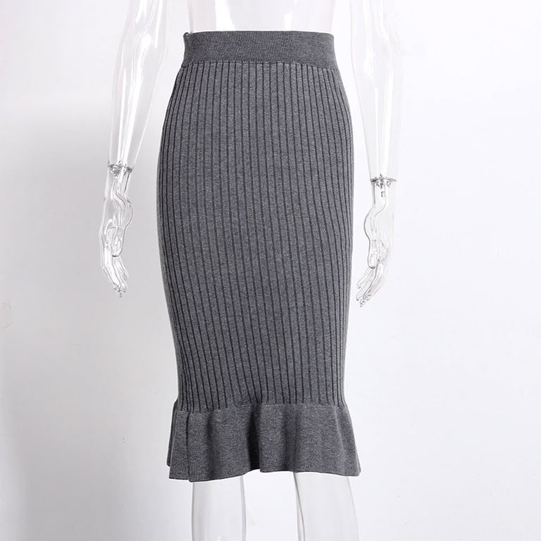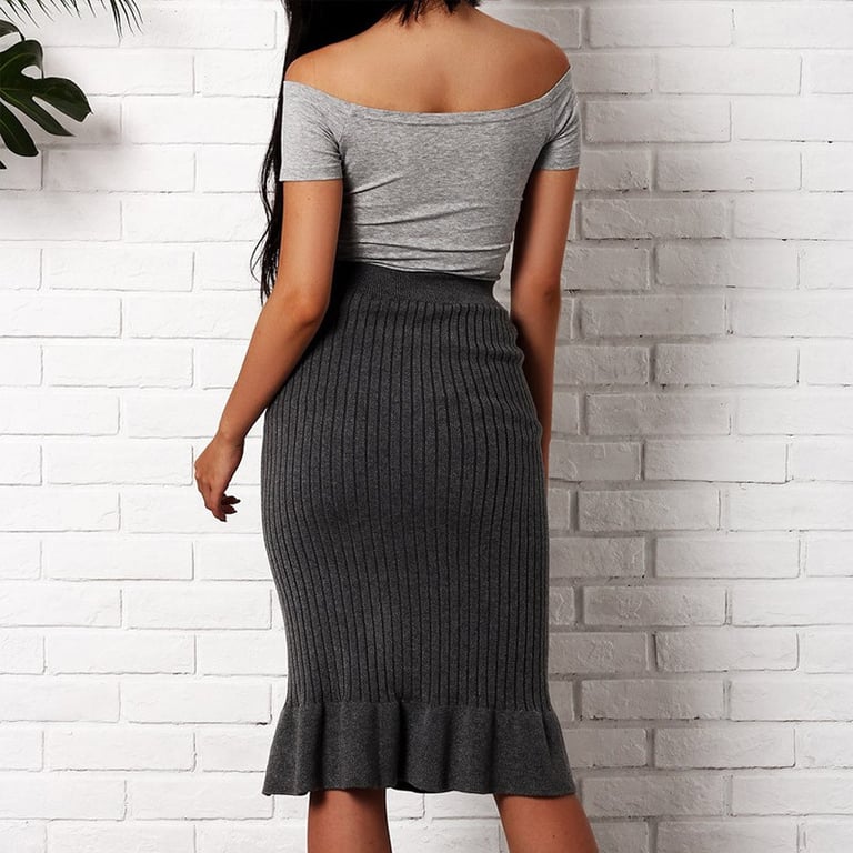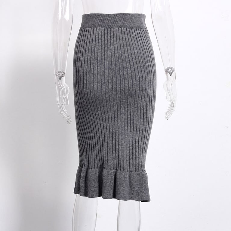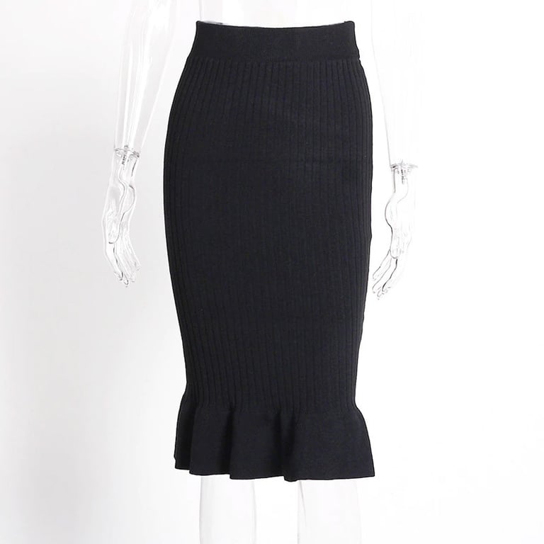 Ženska rebrasta uska suknja do koljena s visokim strukom. Donji dio suknje ukrašen je volanom. Univerzalna veličina.