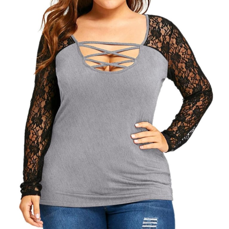 Plus size ženska majica Madilynn s čipkastim rukavima – siva
