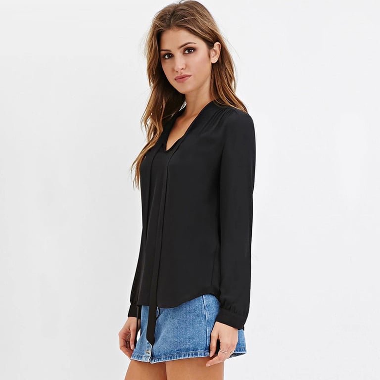 Ženska bluzica slobodnog kroja s V-izrezom i ukrasnom mašnom oko vrata. Bluzica ima dugi rukav s dugmetom. Lagani prozračni materijal. Plus size veličine. Dostupna u nekoliko varijanti.