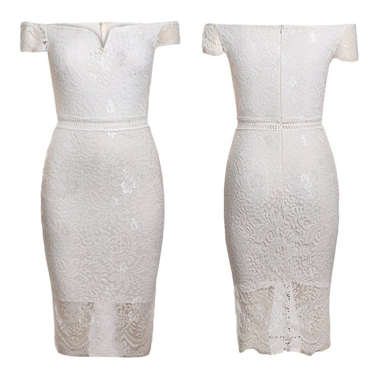 Ženske čipkaste haljine s otkrivenim rukavima i kratkim rukavima. Haljine su uske i imaju dužinu do koljena. Dostupne su u tri boje.