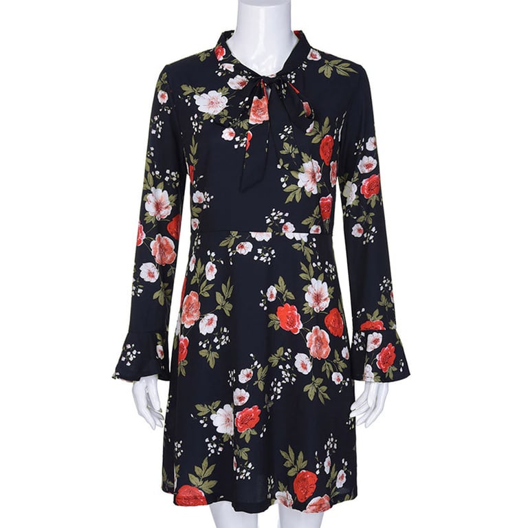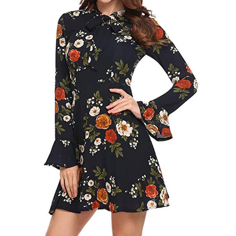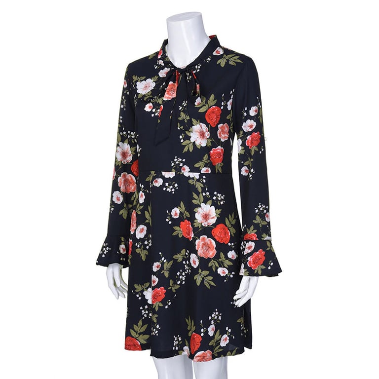 Ženske prozračne haljine s cvjetnim uzorkom. Haljina ima slobodnu preklopnu suknju i dugi rukav s volanom. Oko vrata je mašna. Dostupno u nekoliko varijanti.