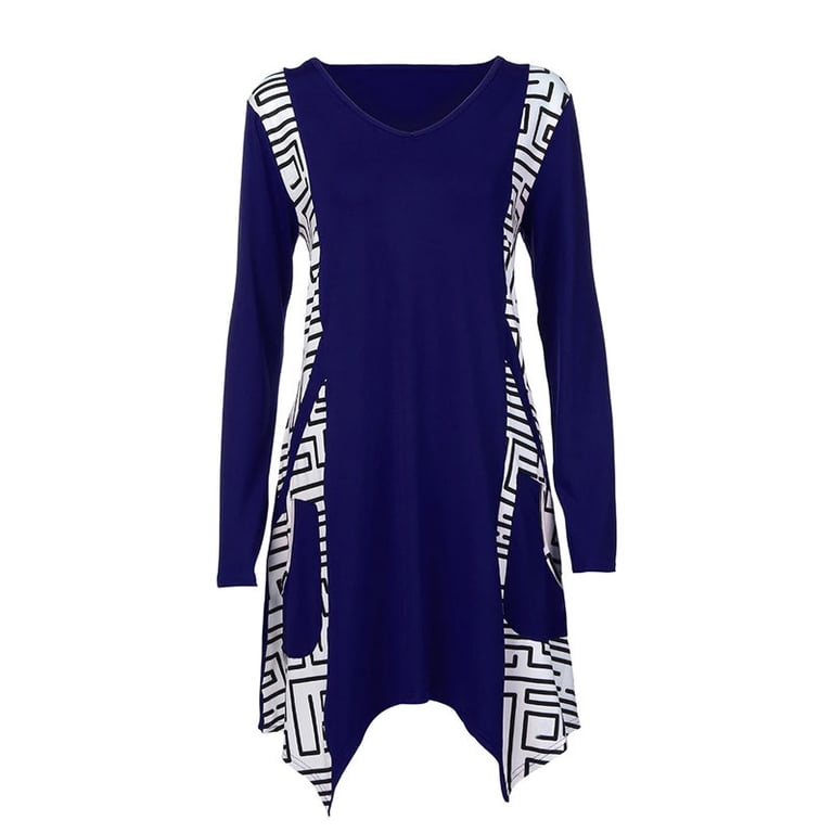 Ženske lepršave haljine s asimetričnim krojem. Haljine imaju dugi rukav i V-izrez. Geometrijski uzorak sa strane i dva bočna džepa. Dostupne u nekoliko boja i plus size veličinama.