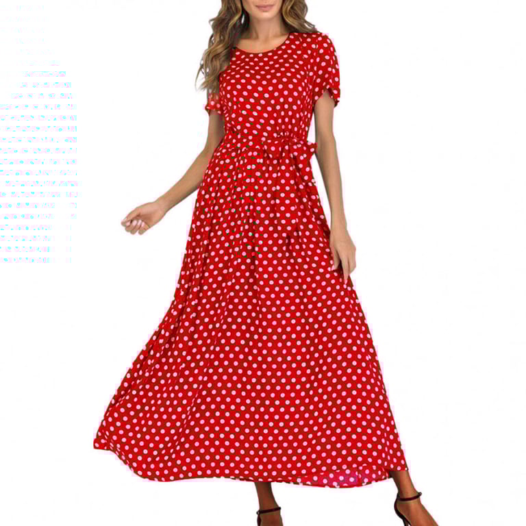 Dame duge haljine s remenom za vezanje u struku. Kratki rukav i okrugli izrez. Uzorak s točkicama. Na izbor više boja.