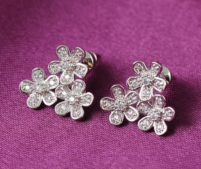 Ženske naušnice ukrašene su cvijećem i kamenčićima. Dostupne u srebrnoj boji.