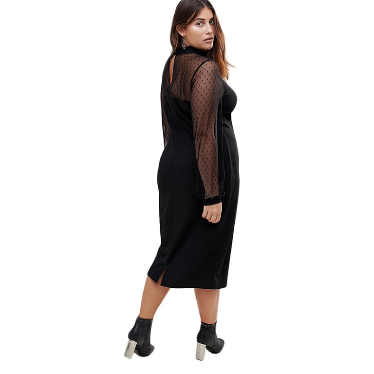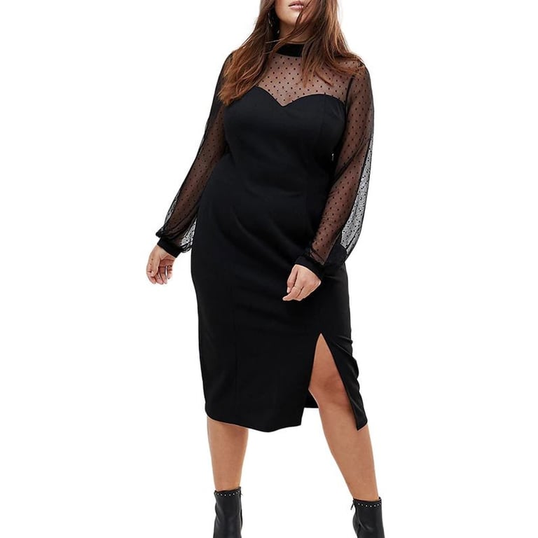 Ženske plus size večernje haljine s dugim rukavima. Ravni kroj do koljena s prozirnim dekolteom i diskretnim prorezom.
