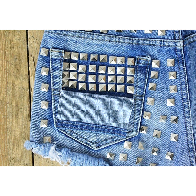Ženske traper kratke hlače ukrašene metalnim zakovicama u srebrnoj boji. Visoki struk. Izrezane s dekorativnim poderotinama. Stylish komad.