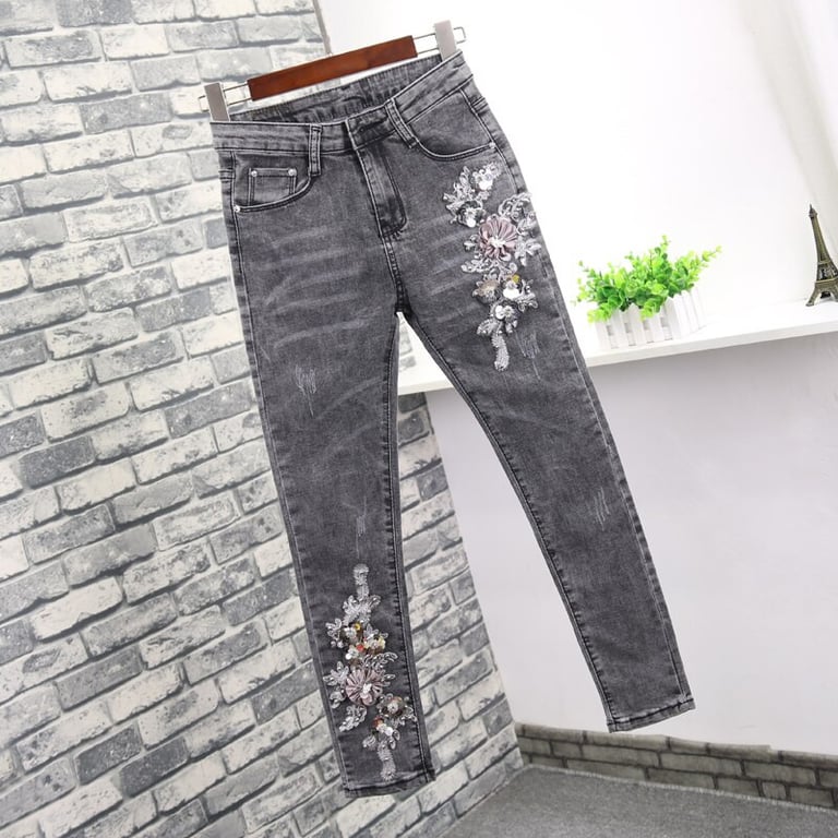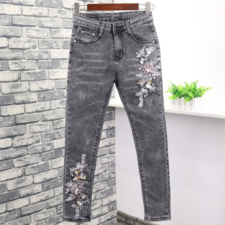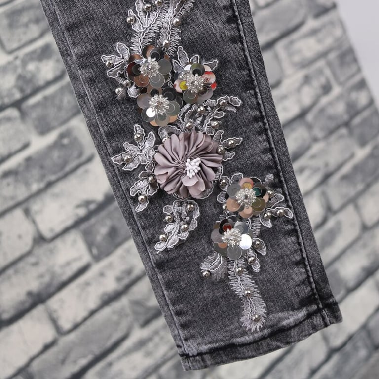 Ženske traperice s srednje visokim strukom. Skinny kroj s uskim nogavicama. Elastične. Ukrašene cvjetnim aplikacijama.