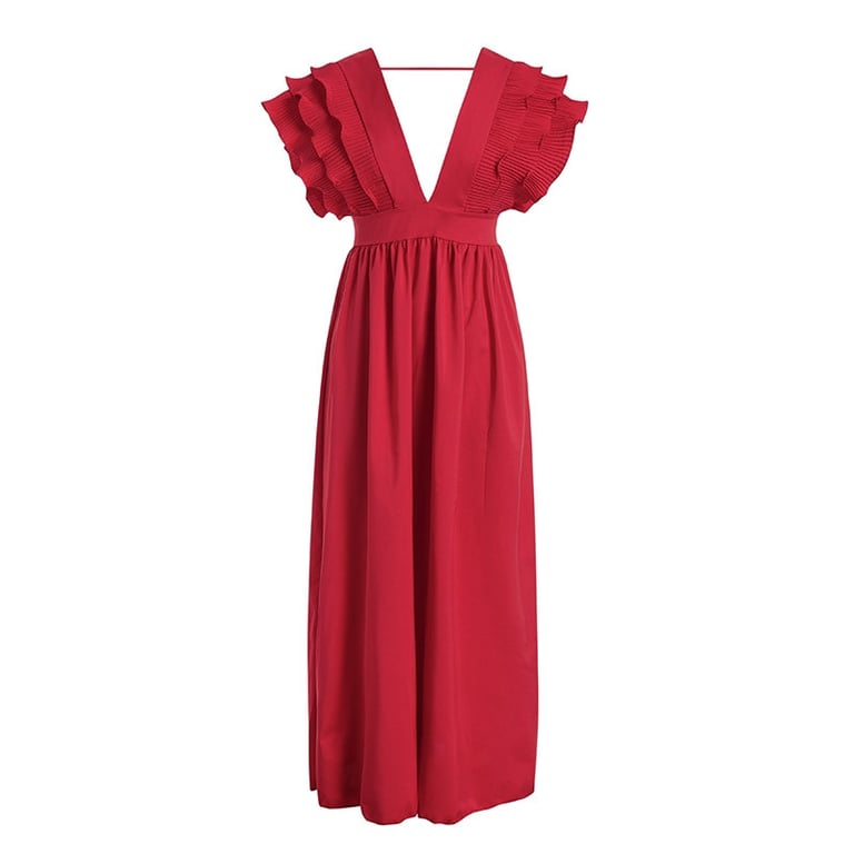 Ženske večernje haljine s nabranim rukavima i dubokim izrezom sprijeda i straga. Suknja je duga i lepršava do tla. Na izbor pet boja.