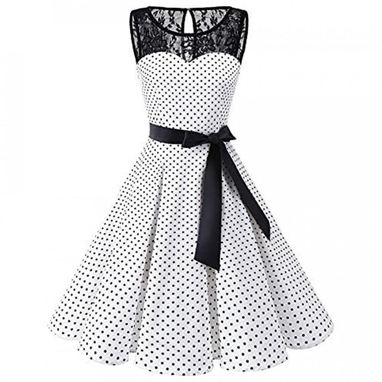 Ženske haljine u vintage stilu. Haljine su bez rukava s izrezom ukrašenim čipkom. Široka A-linija suknja s trakicom u struku. Točkasti uzorak. Dostupno u nekoliko boja.