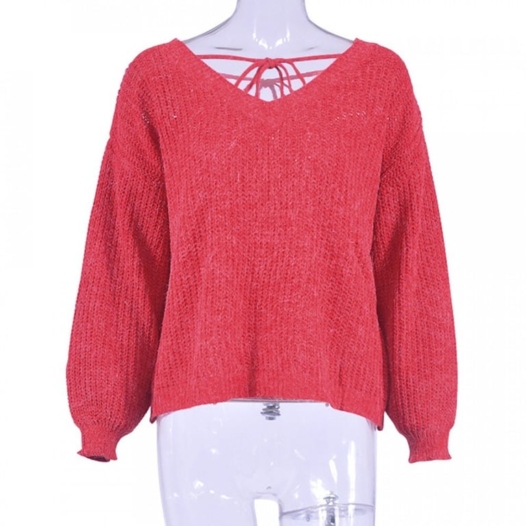 Ženski pleteni pulover s izrezom na leđima i vezanjem. Slobodan kroj s dugim širokim rukavima. Više varijanti boja.